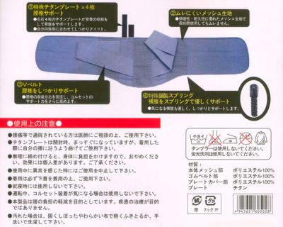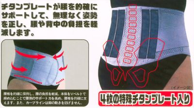 激しい動きにもズレることなく、しなやかにサポート♪特殊チタンプレートが腰を的確にサポートして無理なく姿勢を正し、腰や背骨の負担を軽減します♪メッシュ生地になっているので長時間使用してもムレにくく伸縮性・耐久性に優れています。4枚の特殊チタンプレート入り