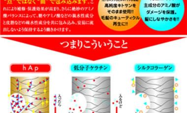 分子量20,000〜40,000の高分子ケラチンが髪内部に浸透して、結晶型ケラチンを補給。髪表面は勿論のこと、内側まで完全栄養補給。驚くようなツヤと潤いを実感!