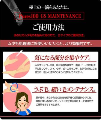 ムダ毛処理のシーズン到来!様々な方法で行うムダ毛処理・・・。でも、処理した後に、脇・腕・ビキニライン・スネなどにどんどん、太い毛が生えてくる!!こんな経験ありませんか?それもそのはず、【ムダ毛】って、処理した後が一番大切なんです!今まで様々なムダ毛処理を試してきた方へ、大切なアフターケアだからこそ、お奨めしたい抑毛専用原液100%『ムダ毛ゼロ!』への強力な3つの秘密!! 1、【ムダ毛の成長を抑制】新成分『キャピスロー』が、次々に生えてくる毛を細く薄くし徐々に生えにくくします。キャピスローは、細胞増殖を遅延させる効果があります。 また、むだ毛を薄く柔らかくし色を薄くさせ肌全体を滑らかに見せる事ができます。 2、【一ヶ月たってもムダ毛が生えない!?】キャピスローによる数週間のトリートメントで、ムダ毛の色や硬さも薄くやわらかくなり、肌全体が滑らかに!使用を止めた1ヶ月後の肌にも抑毛の効果が実証データでも確認されました。 3、処理後の『毛穴の黒ずみ』を解消!■大豆エキス(フラボステロンs)黒ずみは、処理後の雑菌や皮脂・汗などが入り込み毛穴が広がって黒ずんでしまっています。しかし、フラボステロンsはイソフラボンを高濃度含有しているので、女性ホルモン様作用が働きムダ毛抑制のボディケアや色素付着を防ぐ効果を得られることができます。さらに、たっぷりヒアルロン酸を配合!処理した後のカサカサ肌に直接アプローチ! GSメンテナンスは、肌に優しいアフターローションを目指し、ヒアルロン酸をたっぷり配合!ムダ毛処理した後もあなたの肌を優しくいたわります